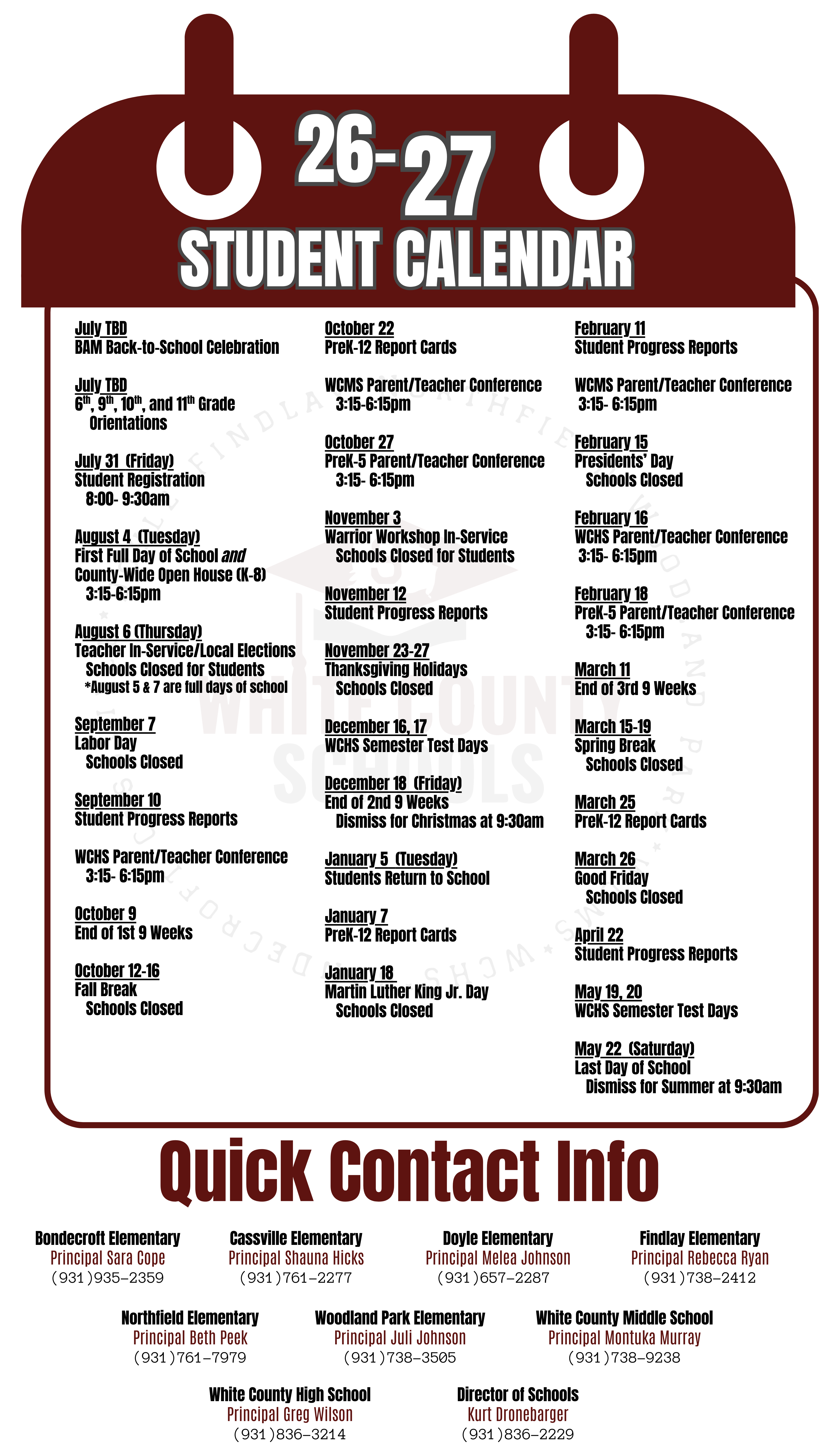 The White County School Board has approved the student calendar for the upcoming school year. Please find a printable version at whitecoschools.net/calendar or use the convenient screenshot below....